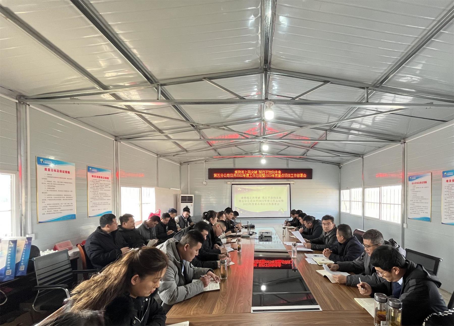 1月30日,第五分公司在无棣黄瓜岭项目部召开2022年度工作总结暨2023年度重点项目工作部署会议,上好“开工第一课”。公司在鲁职工参加会议,会议由党支部书记、总经理蔡国森主持。